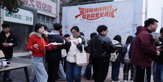 本次活动紧扣雷锋精神内核,进一步巩固了校园文明就餐建设成果,有效激发了同学们主动收餐、自觉光盘的积极性,助力营造“人人学雷锋,个个收餐盘,处处显文明”的校园氛围,为打造整洁有序、互助友爱的食堂就餐环境筑牢基础,让文明在校园日常的点滴行动中落地生根。活动虽已结束,但签字墙上那些名字,会提醒着每一个人:同学们用餐后记得收餐盘哦。